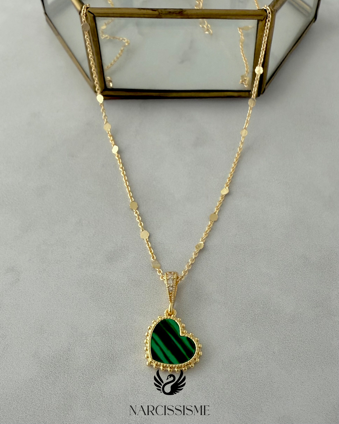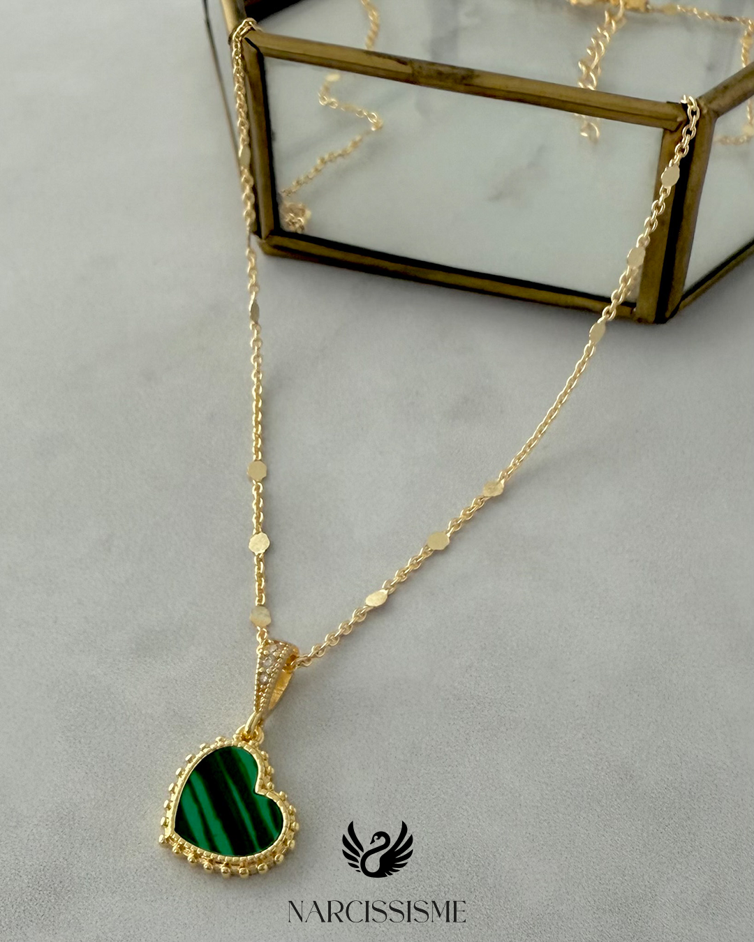 Collar elaborado en oro laminado, con cadena de eslabones delicados que incluyen pequeños discos intercalados. El diseño se complementa con un dije en forma de corazón, en cuyo centro resalta una piedra de malaquita.