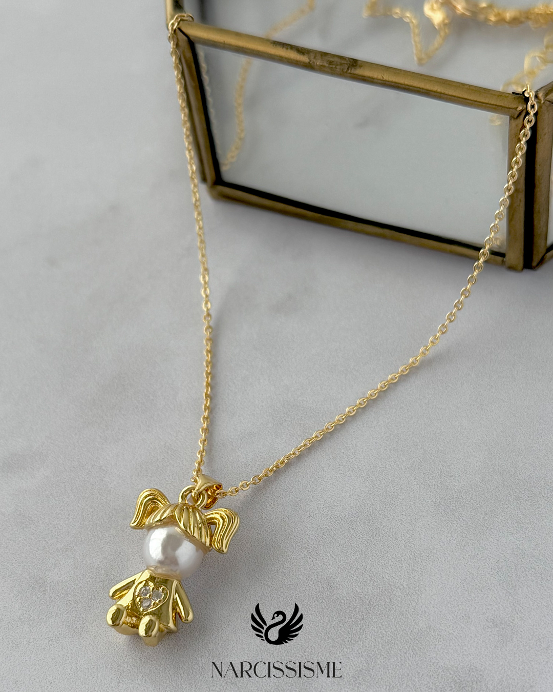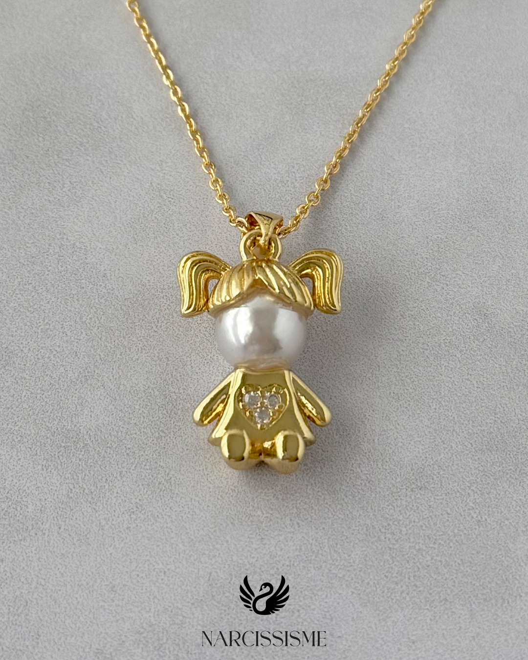 Collar elaborado en oro laminado compuesto por elegantes eslabones ovalados. El diseño se complementa con un delicado dije en forma de niña con la cabeza de perla y el cabello recogido en dos coletas. En su centro, un delicado corazón con incrustaciones de circonias transparentes.