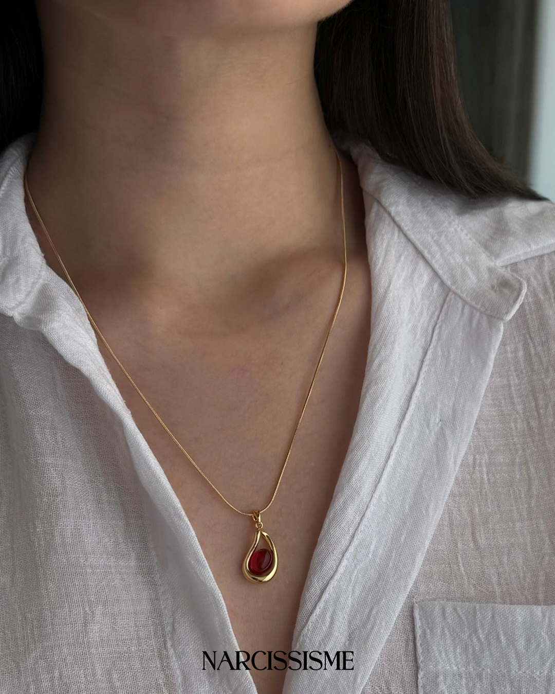 Collar elaborado con cadena tipo cola de raton. El diseño se complementa con un delicado dije en forma de gota orgánico, pulido a mano, que enmarca una piedra natural Cornalina, conocida por su energía vital y su tono rojizo que irradia confianza y pasión. Todo en oro laminado hipoalergénico.
