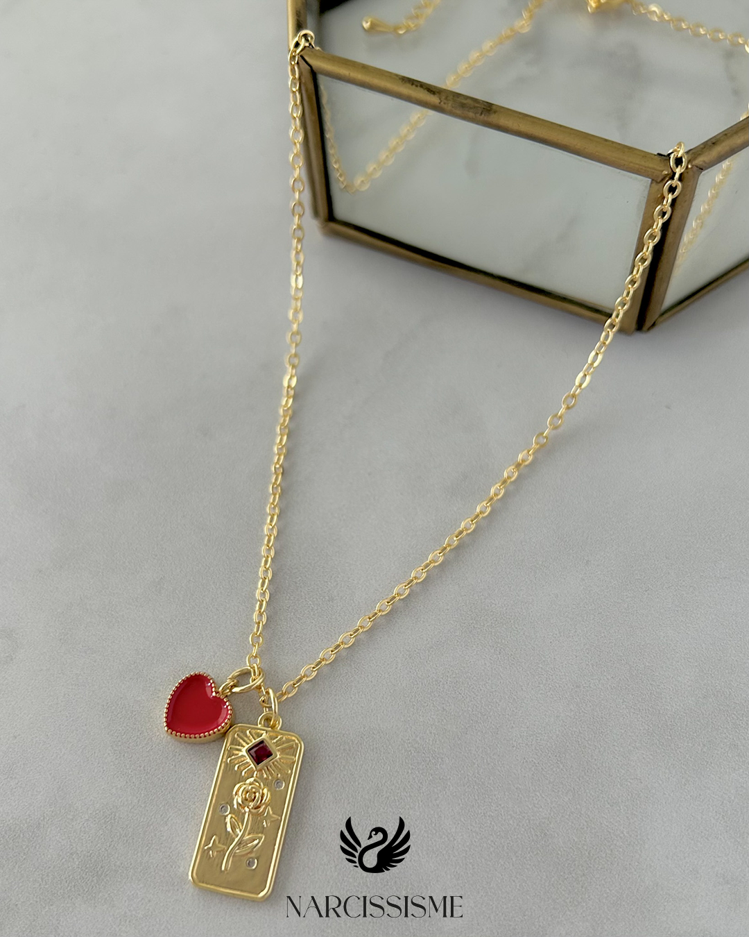 Collar elaborado con cadena de oro laminado, compuesto por eslabones ovalados. El diseño se complementa de dos dijes. El primer dije es un corazón (Ancho:8,7mm. Largo:10,8mm) esmaltado de color rojo vibrante, con un borde dorado fino que realza su forma suave y elegante. El segundo dije tiene forma rectangular (Ancho:10mm. Largo:22,4mm), también en dorado, con un diseño en relieve. En la parte superior del rectángulo se encuentra una pequeña piedra roja, acompañada de rayos dorados que la rodean. En la parte inferior se aprecia una rosa adornada con pequeñas incrustaciones de circonia a su alrededor. Cuenta con una longitud de 40cm + 6,5cm de extensión permitiendo un ajuste personalizado para tu comodidad.