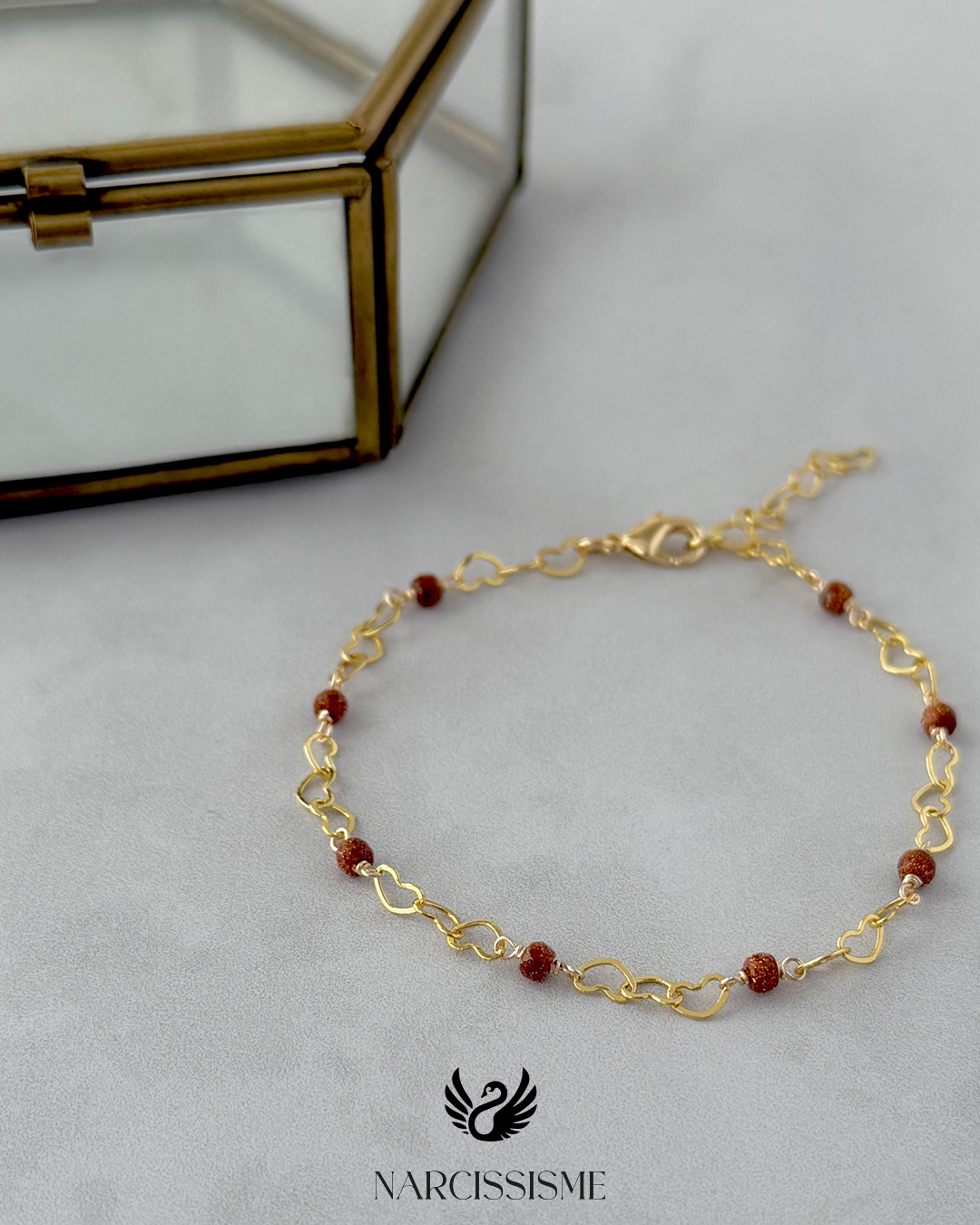 Pulsera elaborada en oro laminado.La cadena está formada por eslabones en forma de pequeños corazones calados que se intercalan con cuentas de piedra Goldstone en tono cobrizo con destellos brillantes que capturan la luz.. Cada unión está realizada con la técnica de nudo de rosario a mano, aportando un detalle artesanal único.