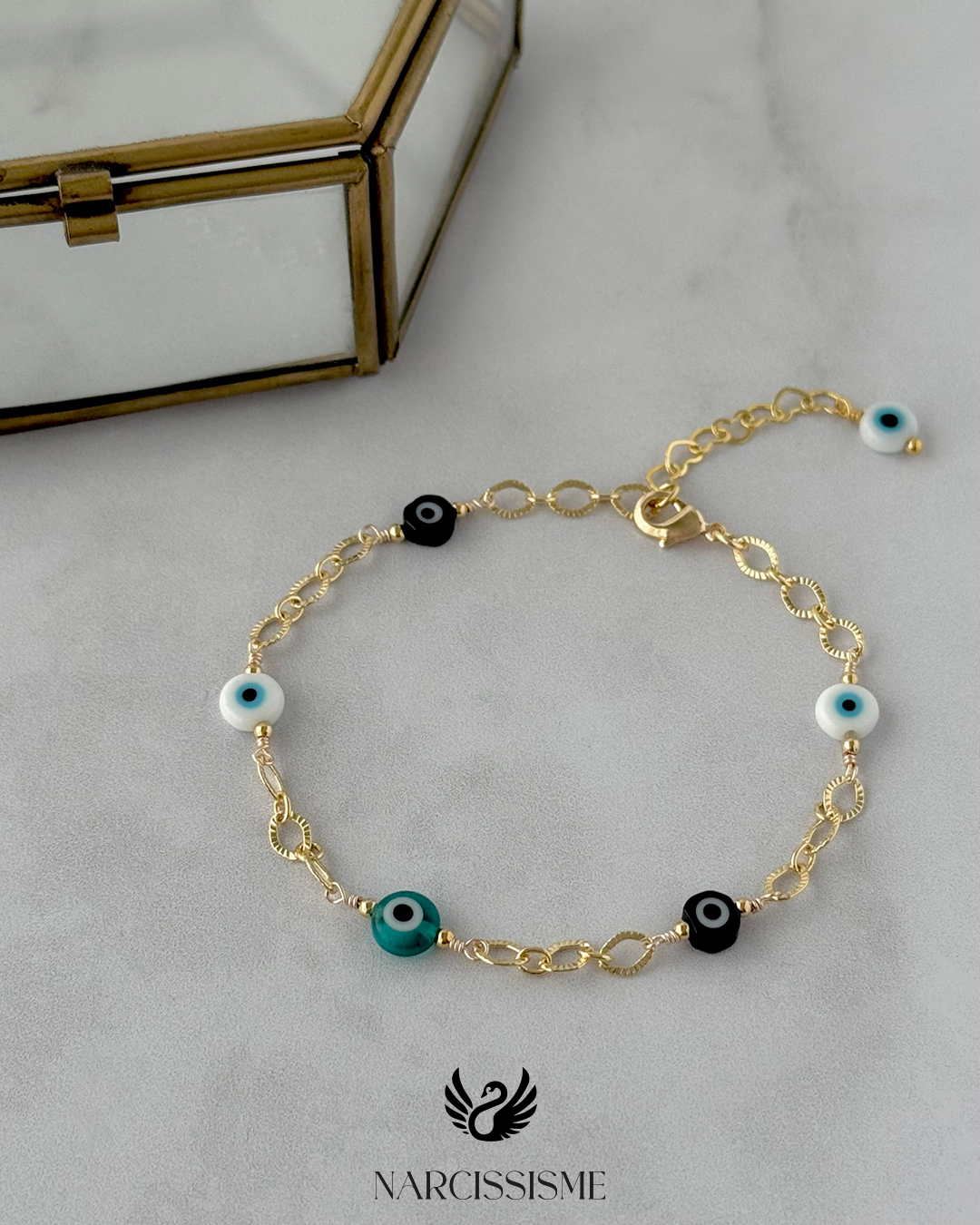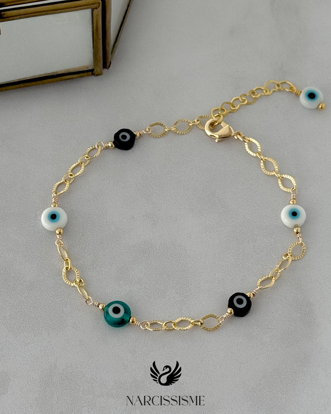 Pulsera elaborado con cadena de oro laminado, compuesto por eslabones ovalados texturados. El diseño se complementa con cuentas de ojo turco en tonos blaco, negro y turquesa. símbolos asociados a la protección y la energía positiva. Se puede enganchar en cualquier eslabón.